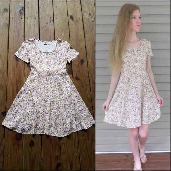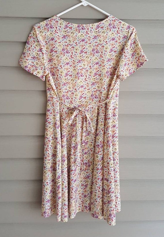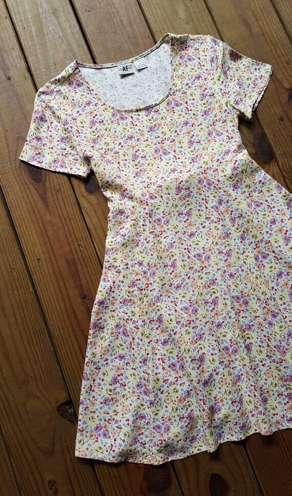 American Eagle Size 6 Vintage 90s Pastel Yellow Purple Floral Short Sleeve Tie Back Rayon Mini Dress 1990s