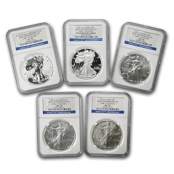 It features the standard bullion issue 2011 silver eagle along with a business strike finish coin minted at the san francisco mint which can be found only in this set. Ships to you in a us mint lacquered proof box. This 2011 25th anniversary 5 coin eagle set features five coins that bear the design of the worlds most collected government bullion coin.
