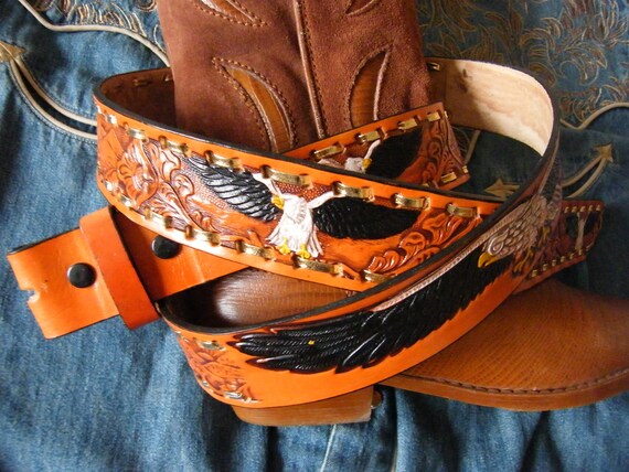 New Handcrafted High Quality Tan Leather Belt Eagle Embossed Mens Ladies Western Cowboy Small Medium Large X Large Xx Large Xxx Large