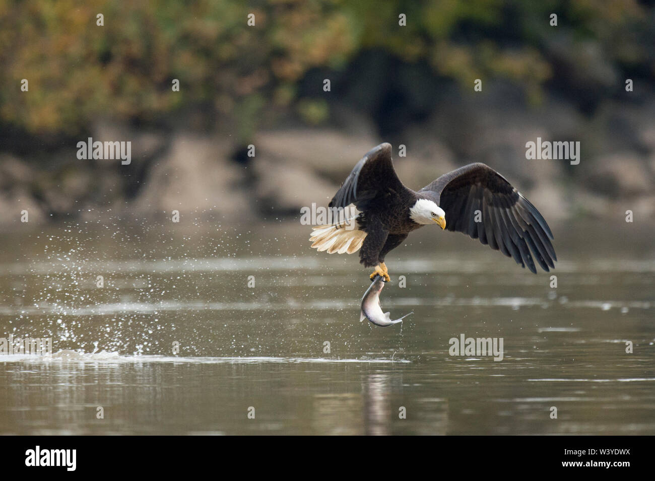 An Adult Bald Eagle Flies With A Large Fish In Its Talons