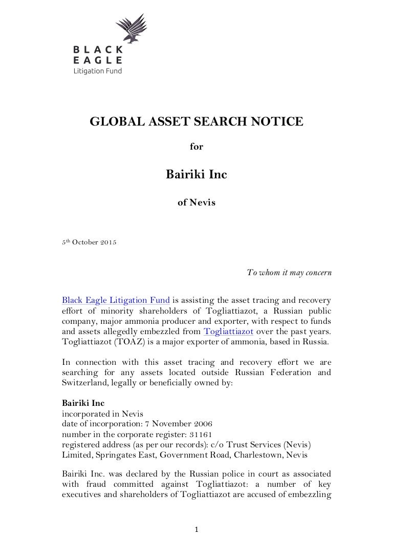 Asset Search Notice For Bairiki Inc Of Nevis Black Eagle