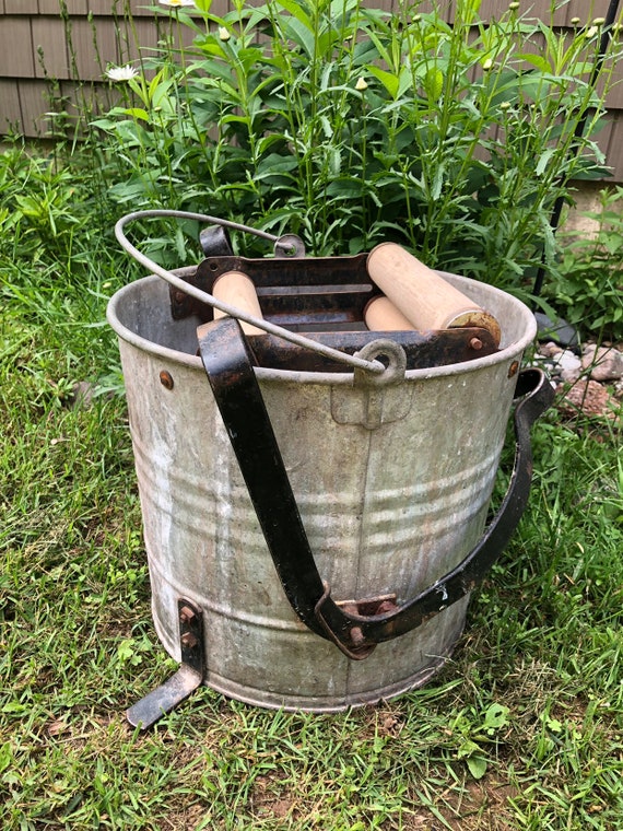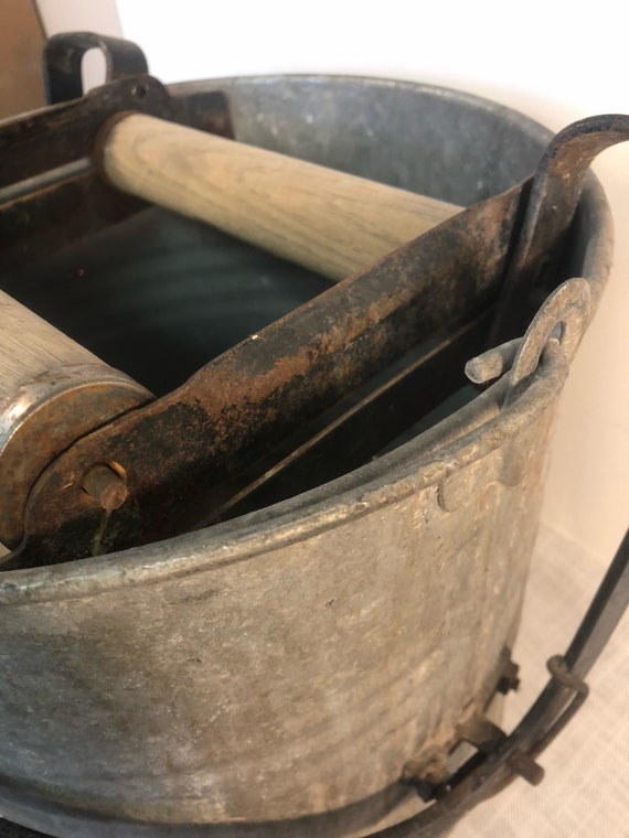 Mid Century Eagle 22 Mop Bucket Wood Rollers Foot Wringer Pedal Works Holds Water Galvanized Mop Pail Distressed Rusty Metal Spots